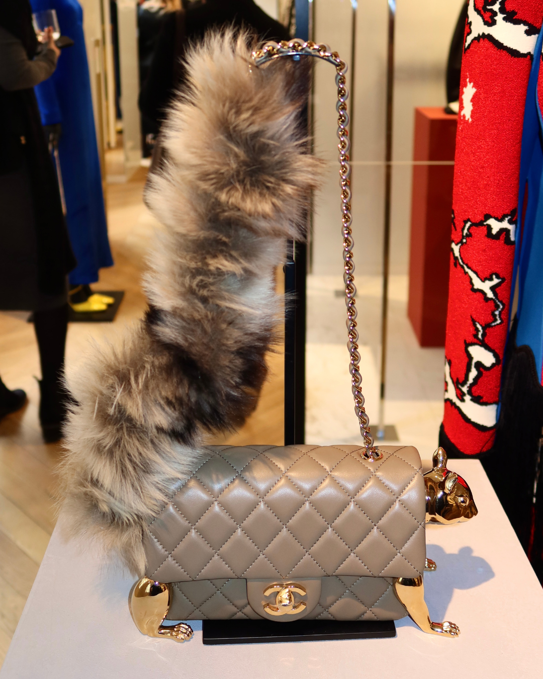 Blazy, Chanel’in klasik çantalarını bu kez deneysel bir yaklaşımla yeniden ele alıyor. Kürk kuyruklar ve heykelsi metal detaylar, sincaplar, zürafalar, elmalar ya da bir fındık formunda, çantanın üzerine eklenen süsler olmaktan ziyade formun kendisini belirliyor. Tüy motifli etekler paralel bir hatta geri dönüyor, ancak bu kez daha kentsel bir dile uyarlanmış hâlde. Goossens imzalı mücevherler, bu sembolik dili tekrar ederek koleksiyonla uyum içinde ilerliyor.